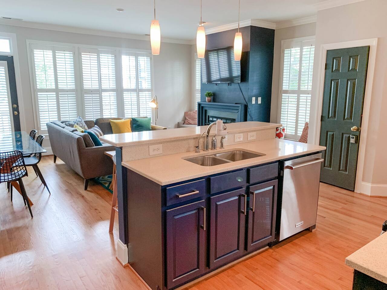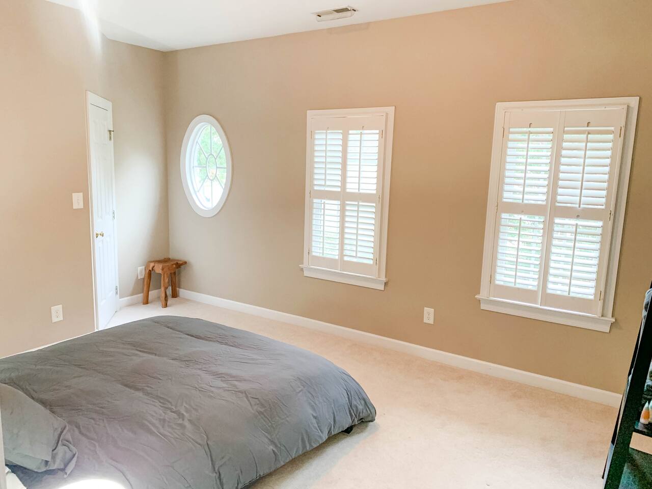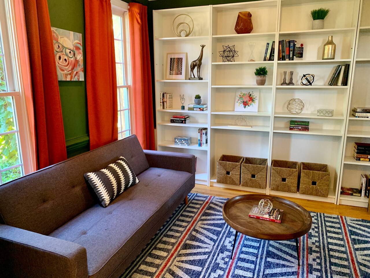 There is one additional sleeper sofas for larger groups. The sleeper sofa in the library sleeps one (1). The library is in a separate sectioned off room. As the morning light pours through our custom plantation shutters enjoy cooking in our fully stocked kitchen (see photos). Kitchen has custom cabinetry, subway tile backsplash, quartz countertops and stainless steal appliances. With 10' ceilings and an open concept- you will love how spacious our home feels. The kitchen flows into the stunning living-dining room combination. Warm up by the gas fireplace, watch a movie on the 55" Roku SmartTV and take your breakfast on our floating bench. Enjoy one of our books in our second living area- the perfect place to read or play games. Spend time on the brick patio at the front of the home or on the back deck. The Master bedroom has a beautiful King sized canopy bed. Watch a movie on the 43" Roku TV or get some work done on the in room desk. Be careful not to get lost in the large custom built master closet. The master bathroom has a double sinks, shower and 10" ceilings. Bedroom number two has a comfy queen bed and lots of space. It also has a private bathroom and walk-in closet. The living room has a queen sized sleeper sofa (sleeps 2). The library has a sleeper sofa that best sleeps 1 person. It’s a bit larger than a twin when laid out.