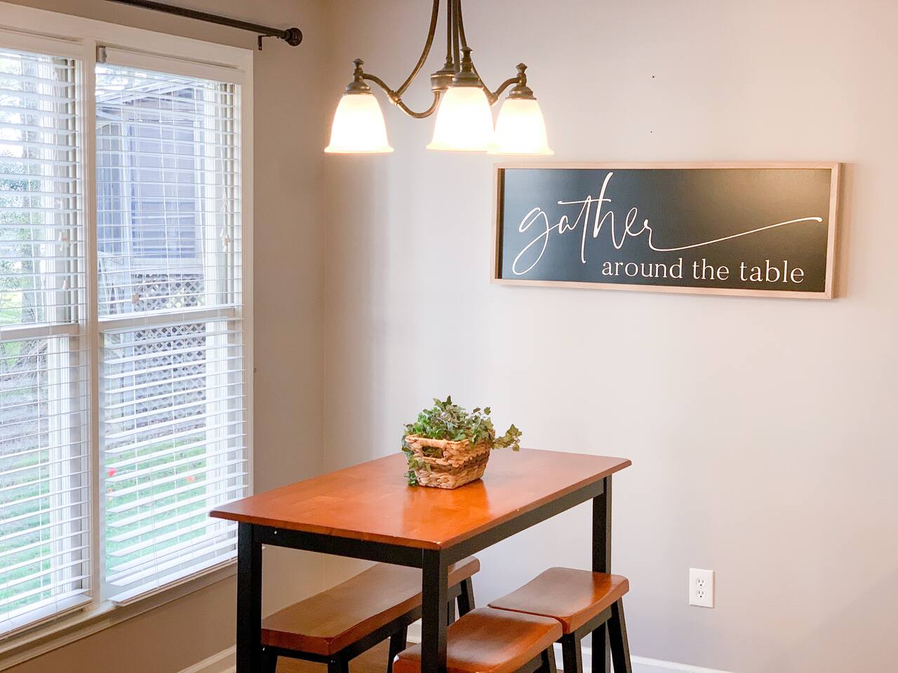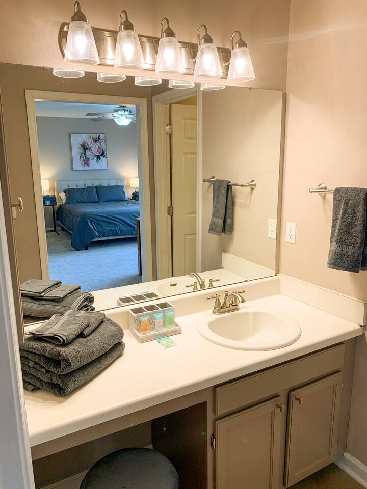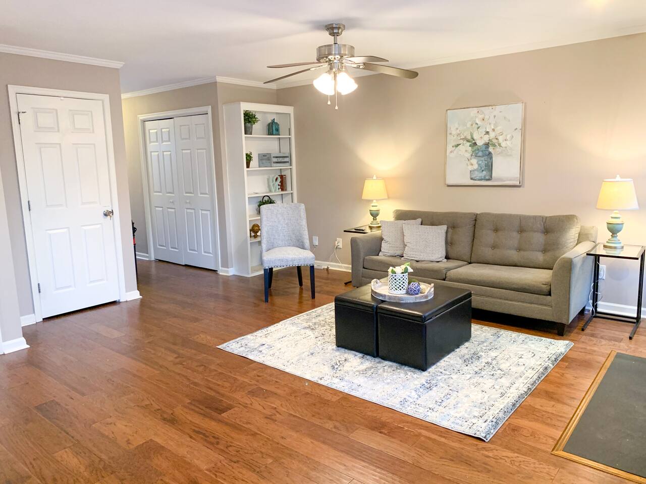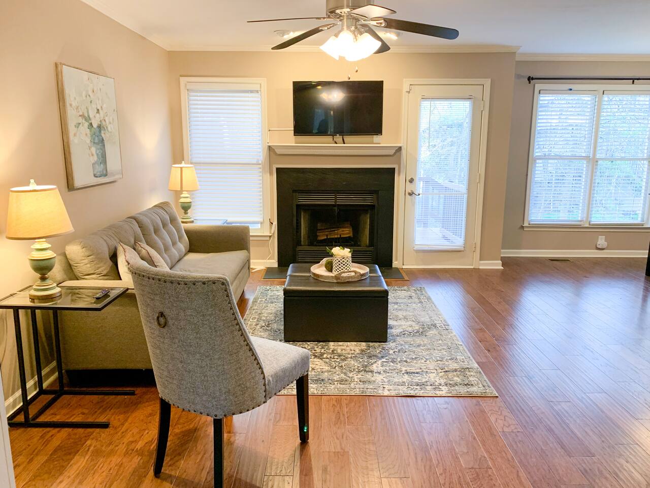 Come home! This stunning 2 bedroom 2.5 bathroom townhouse is located in the quiet Woodcroft neighborhood. This townhouse sleeps 7 people (1 King, 1 Queen, 1 Twin and 1 queen sized sleeper sofa). Staying here comes with access to the six miles of walking/biking trails in the communities more than 200 acres. ' Enjoy our relaxing back deck, high-speed Wifi, full stocked kitchen, two smart TVs, King suite and much more.