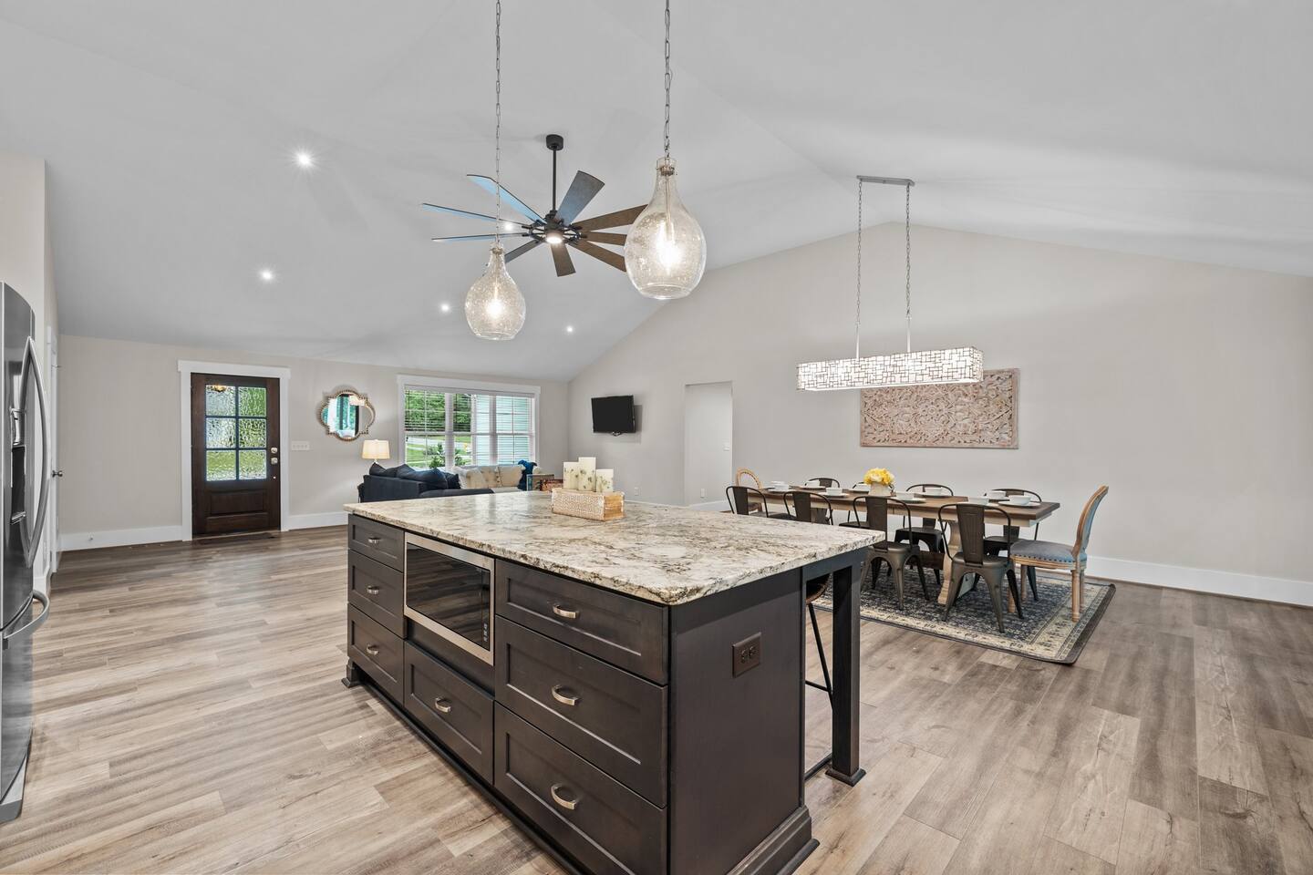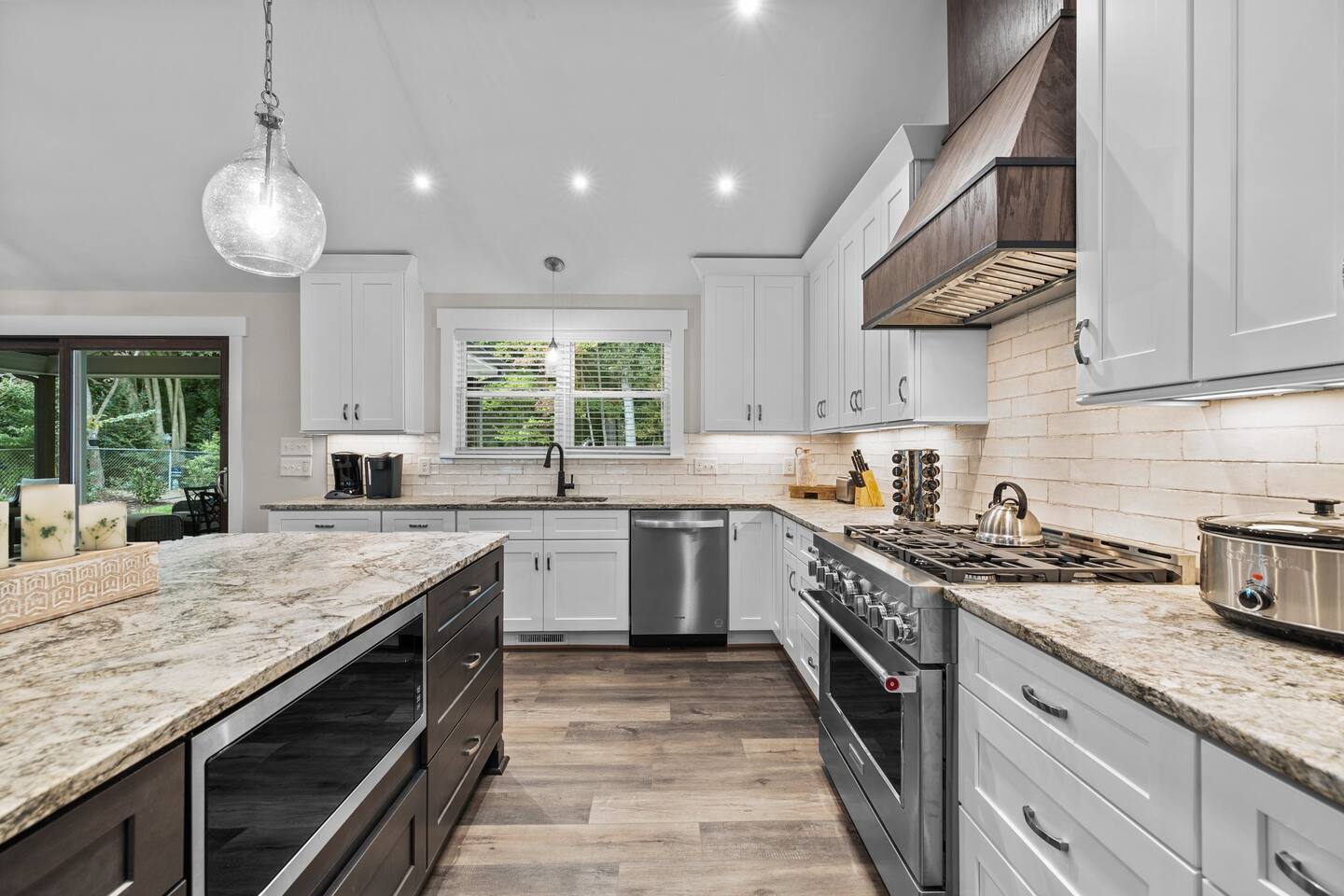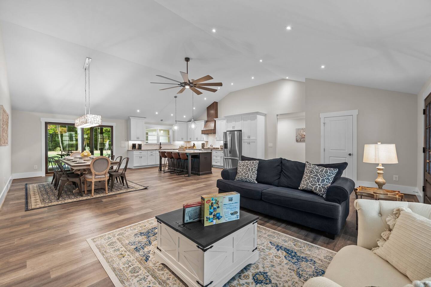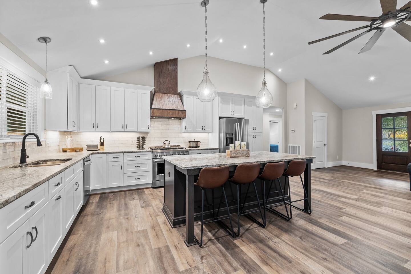 To enter home you will have two steps up on to the porch Living room- 60" T.V with pull out queen sleeper sofa Kitchen- Fully stocked, granite counters, kitchen island with seating for four, dining room table with seating for 10. Master bedroom- King bed, T.V., work desk Master bathroom- tile shower, granite vanity. Bedroom 2- Queen bed Bedroom 3- Queen bed Bathroom 2- Shared between bedrooms 2 and 3. Bedroom 4- Queen bed Bathroom 3- located in bedroom 4. Lovely patio with seating, spacious yard for playing, air hockey table in garage.