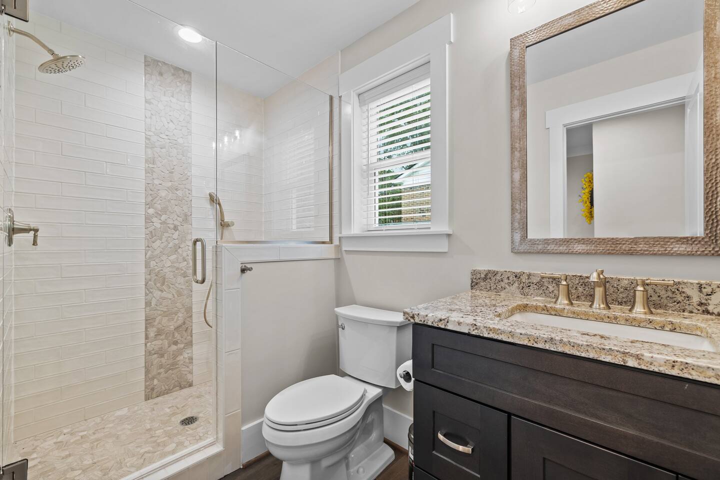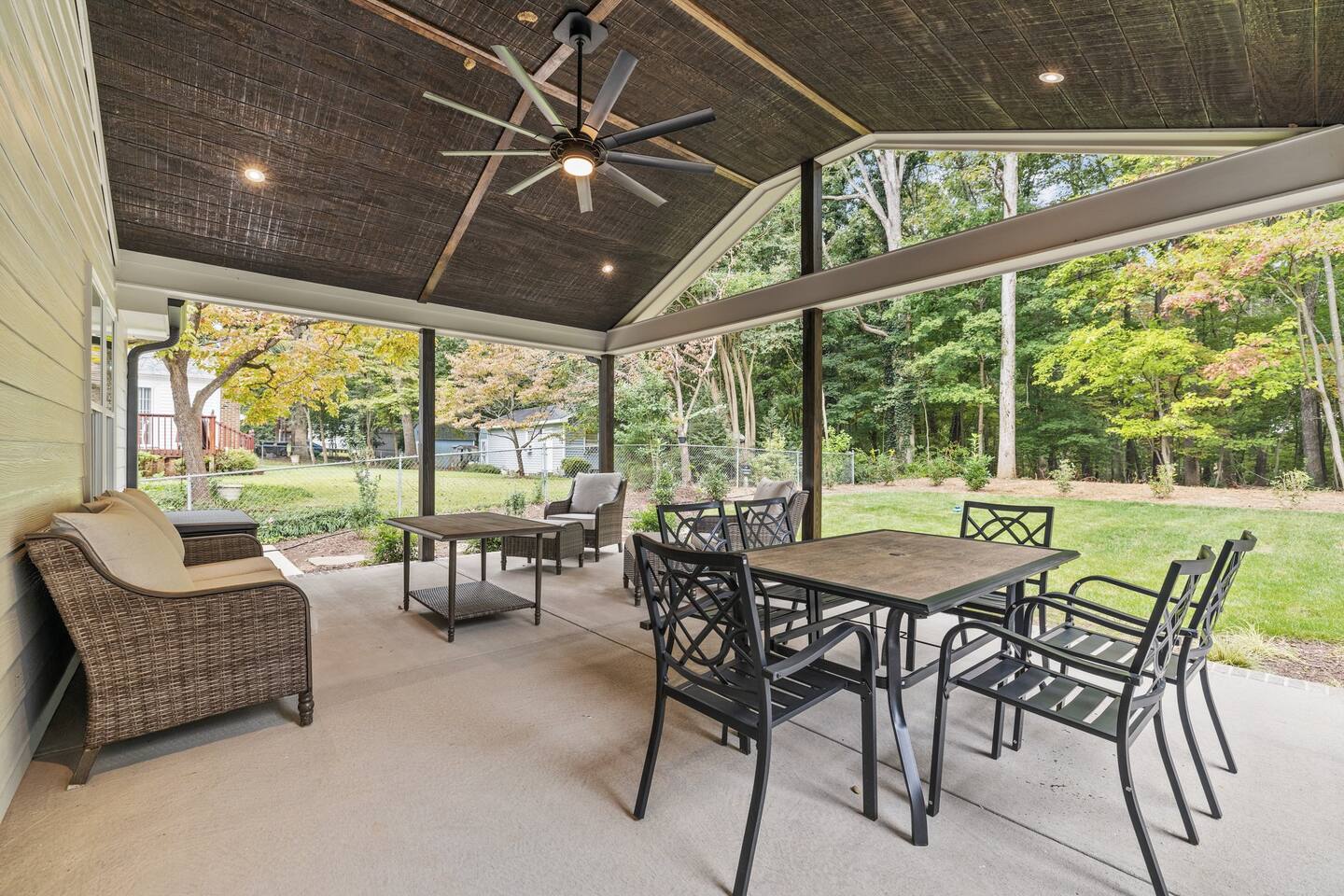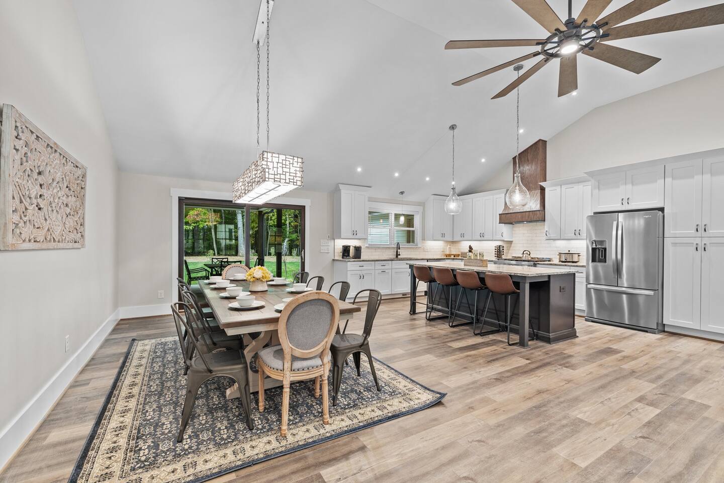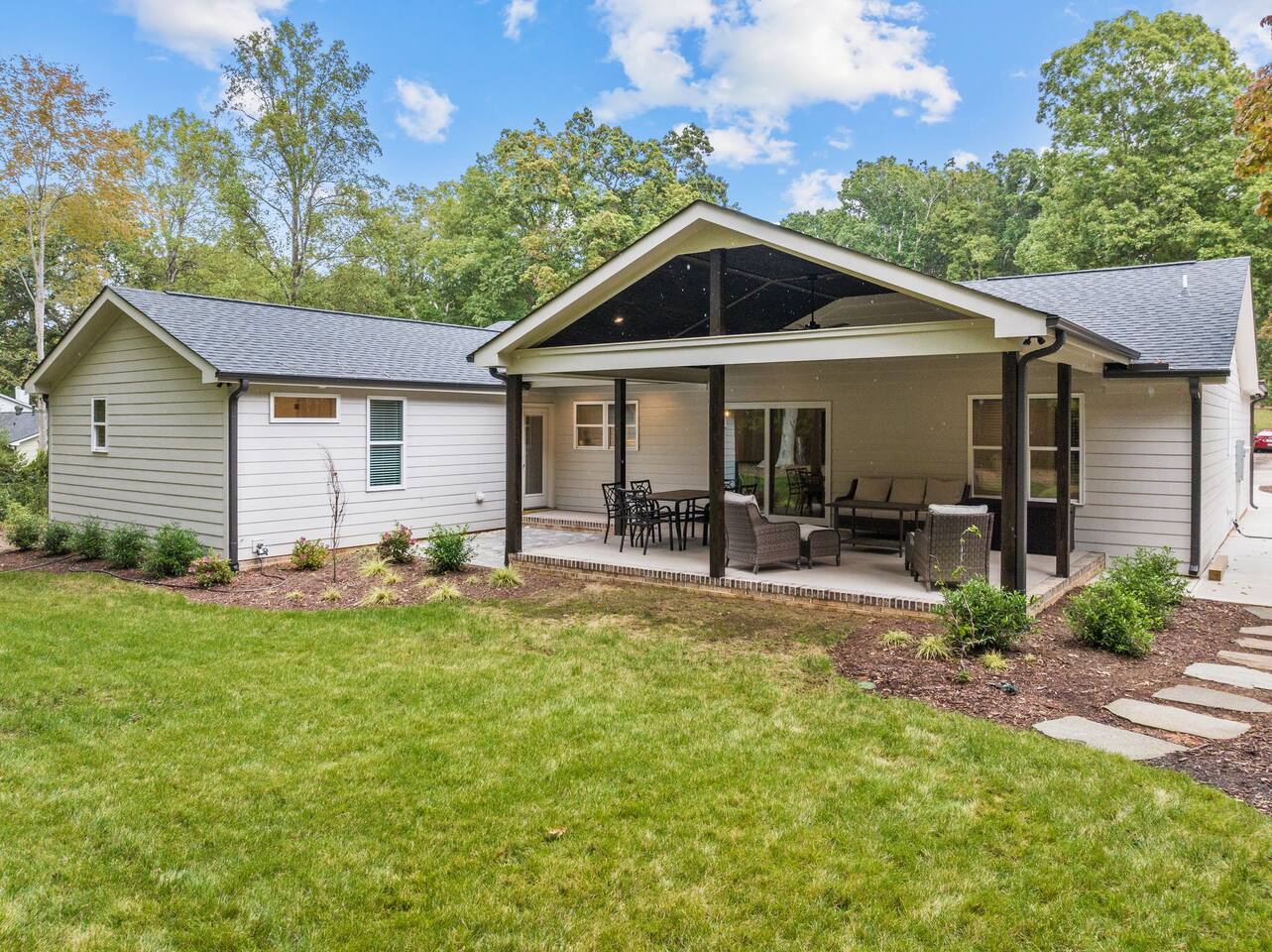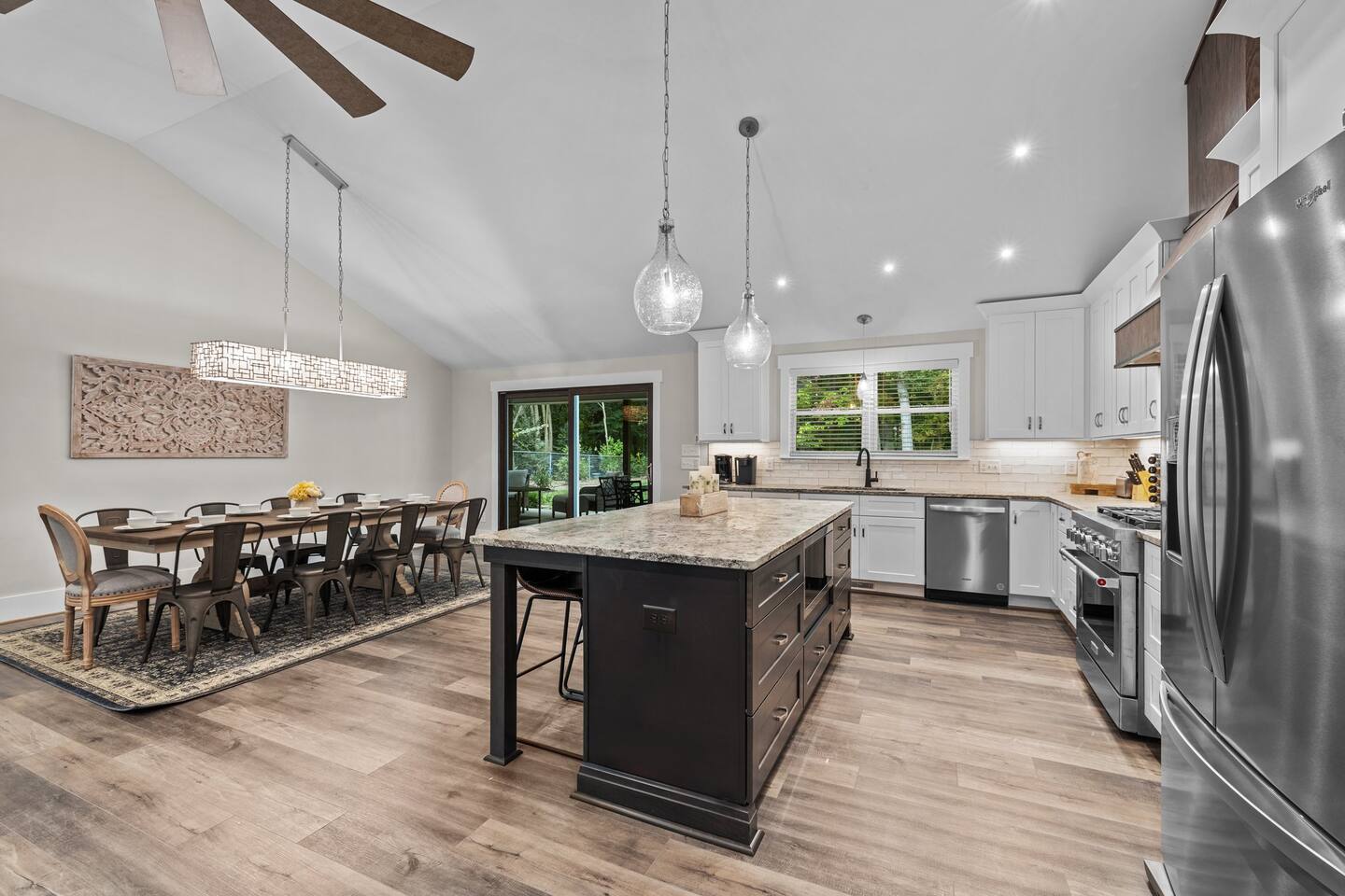 To enter home you will have two steps up on to the porch Living room- 60" T.V with pull out queen sleeper sofa Kitchen- Fully stocked, granite counters, kitchen island with seating for four, dining room table with seating for 10. Master bedroom- King bed, T.V., work desk Master bathroom- tile shower, granite vanity. Bedroom 2- Queen bed Bedroom 3- Queen bed Bathroom 2- Shared between bedrooms 2 and 3. Bedroom 4- Queen bed Bathroom 3- located in bedroom 4. Lovely patio with seating, spacious yard for playing, air hockey table in garage.