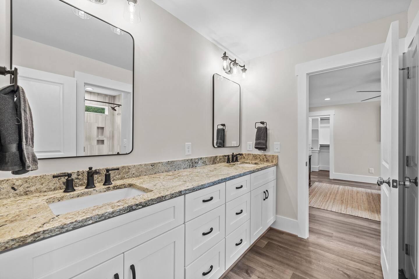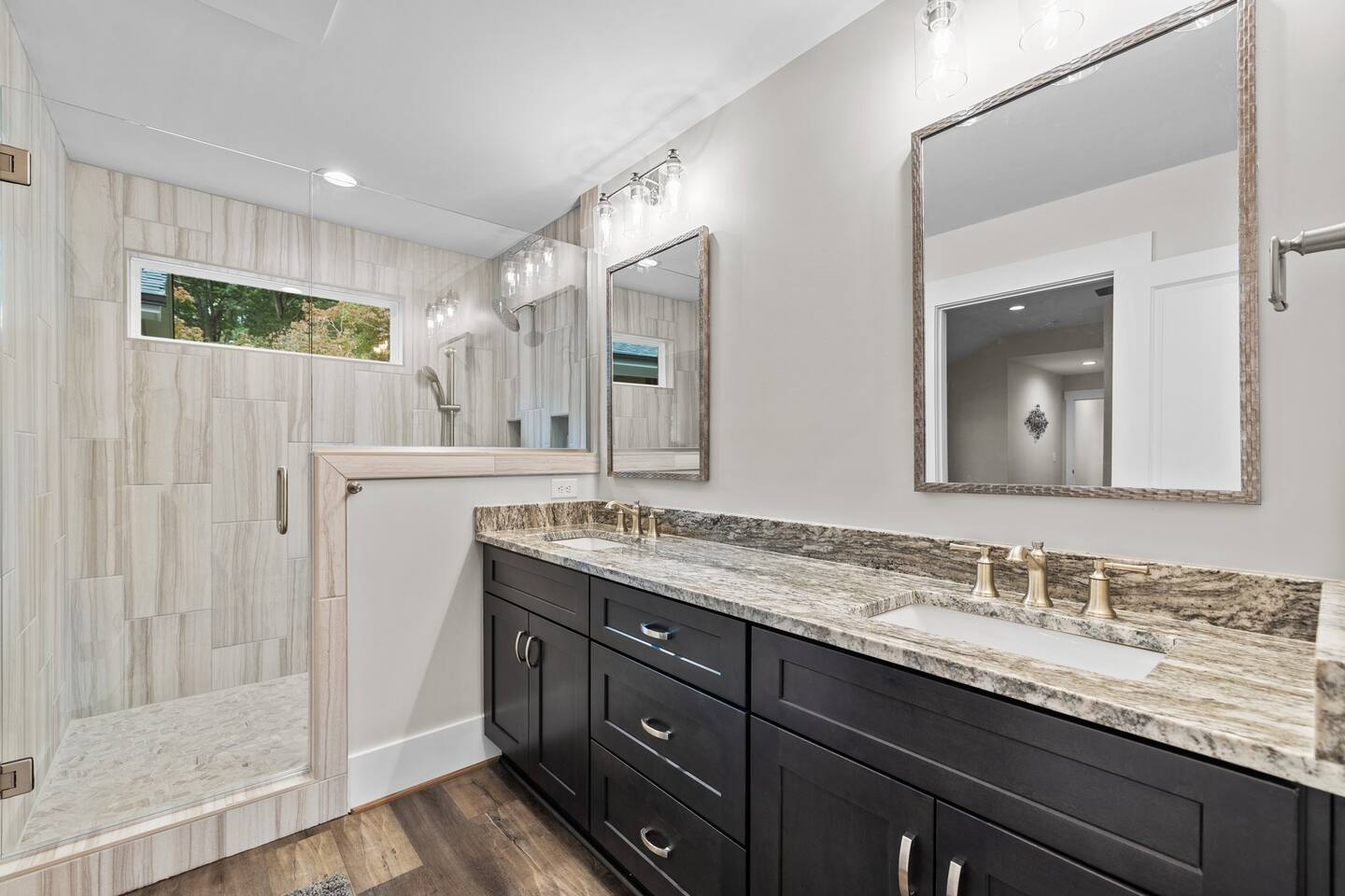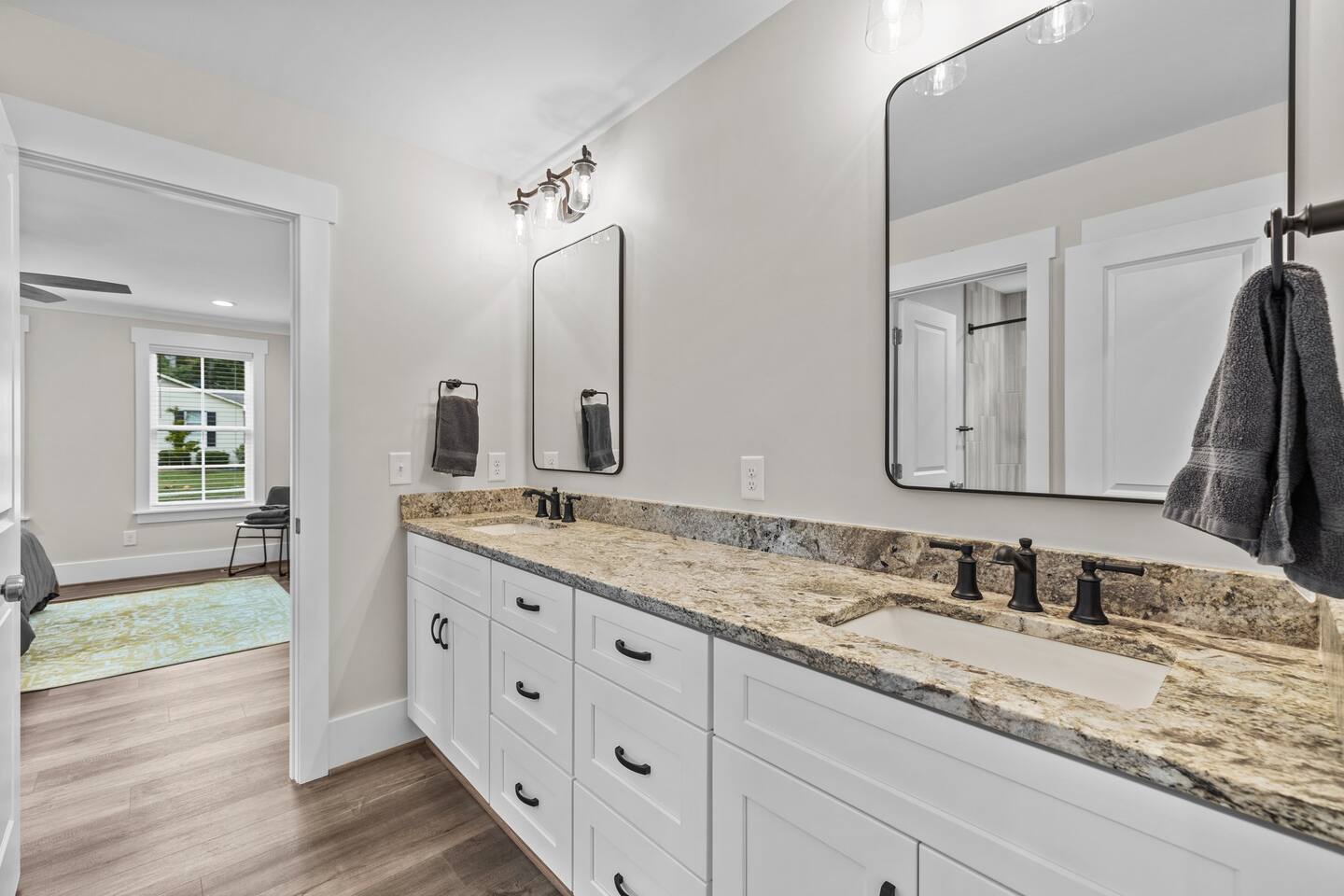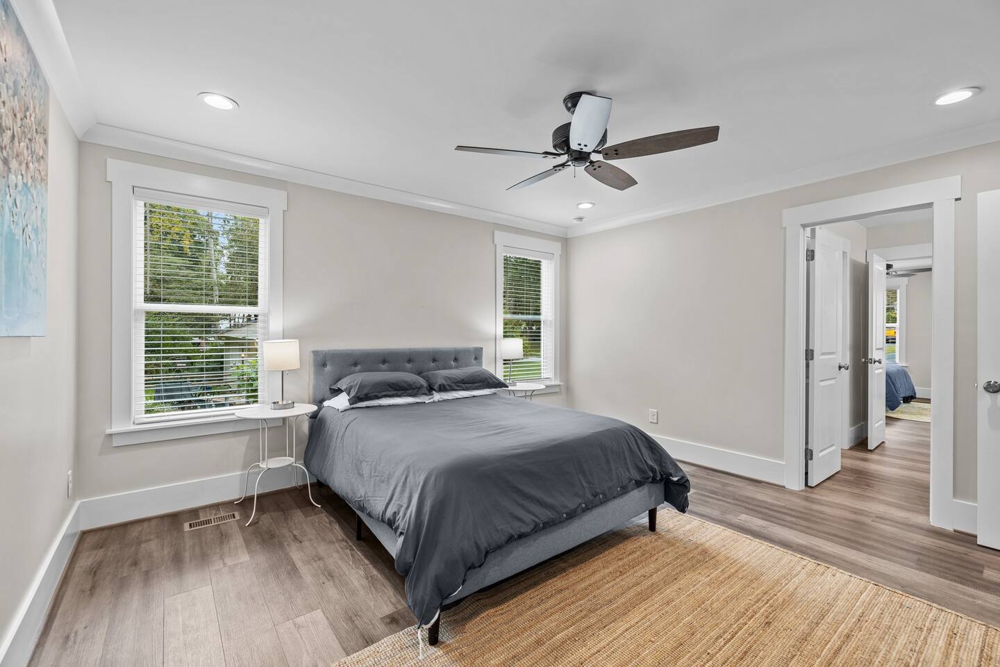 To enter home you will have two steps up on to the porch Living room- 60" T.V with pull out queen sleeper sofa Kitchen- Fully stocked, granite counters, kitchen island with seating for four, dining room table with seating for 10. Master bedroom- King bed, T.V., work desk Master bathroom- tile shower, granite vanity. Bedroom 2- Queen bed Bedroom 3- Queen bed Bathroom 2- Shared between bedrooms 2 and 3. Bedroom 4- Queen bed Bathroom 3- located in bedroom 4. Lovely patio with seating, spacious yard for playing, air hockey table in garage.