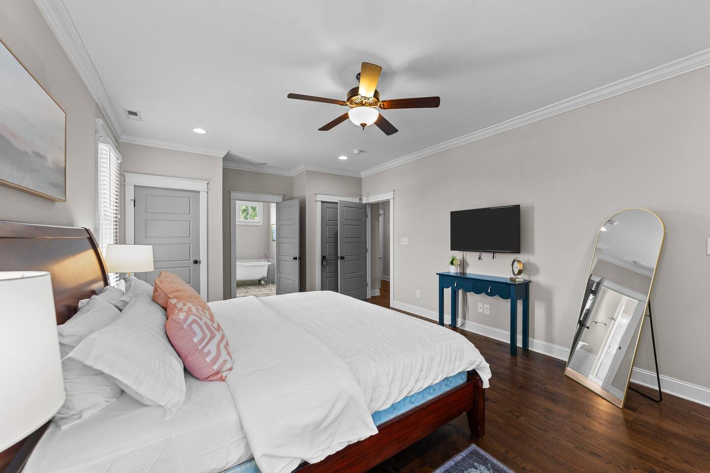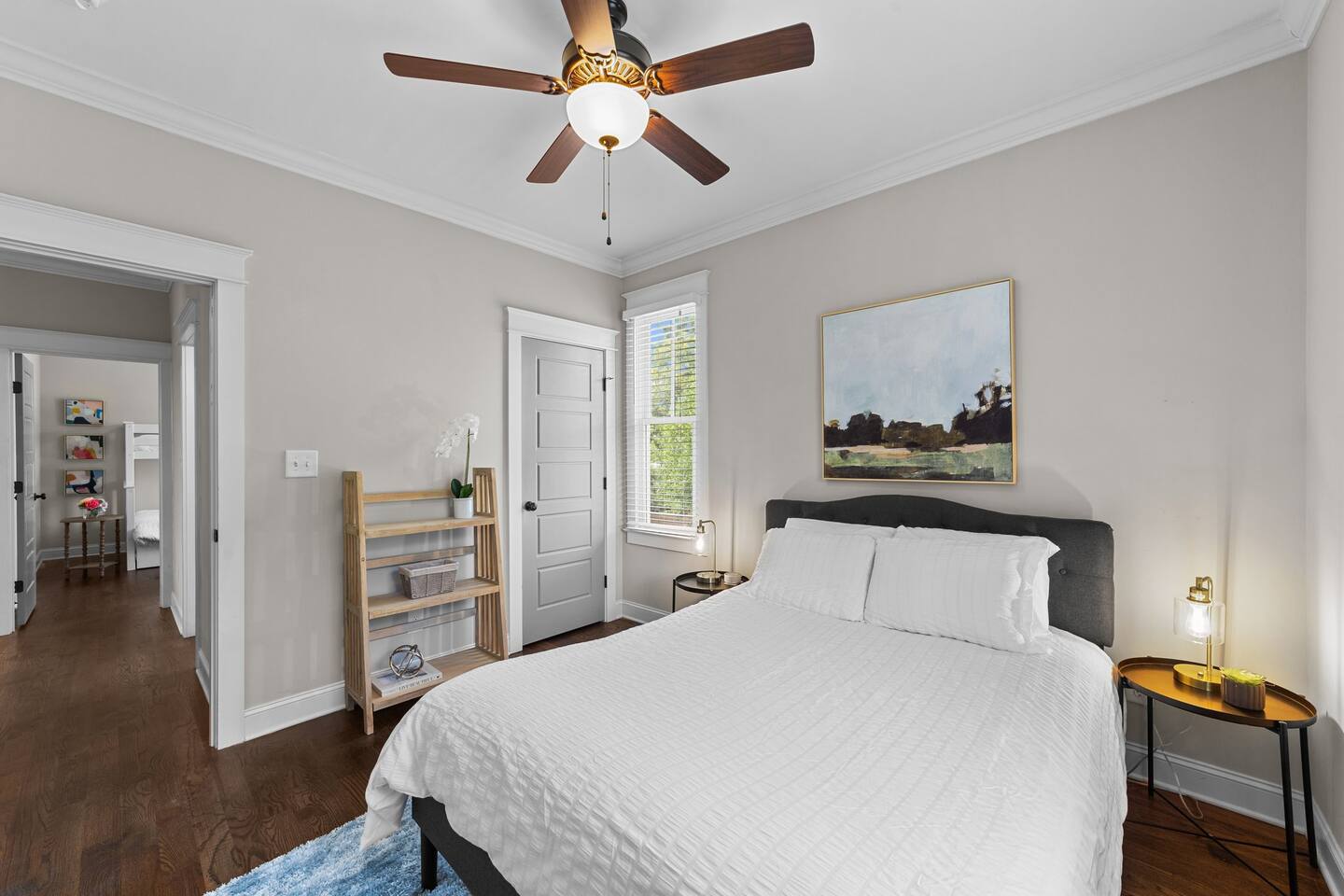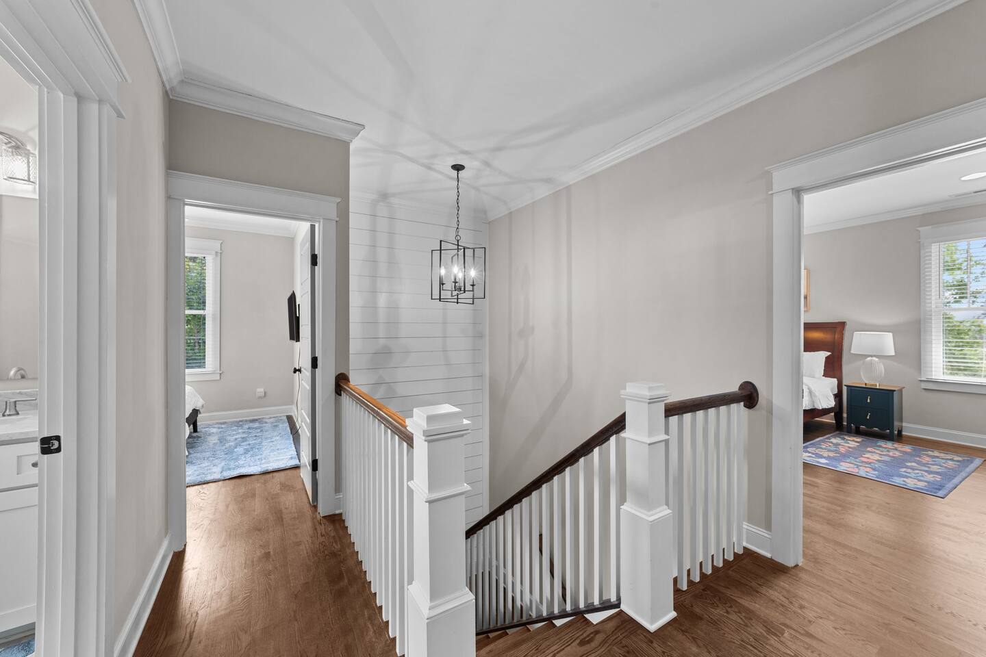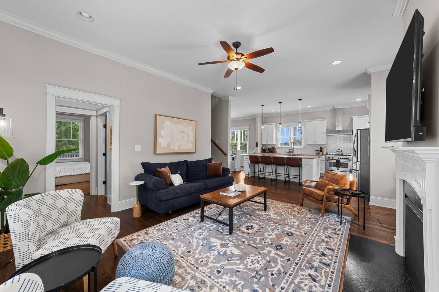 Living Room- 10' ceilings, 65" smart TV, Queen sofa bed, hardwood flooring through out the home, gas log fireplace. Kitchen- Granite counter tops, stainless steel appliances, gas range, built-in microwave, a large island that seats 4. Dining room- Table that seats 10 Bedroom 1- Downstairs, queen bed, ceiling fan. Bathroom 1- Full bathroom, tiled floor, single vanity. **Upstairs- 18 stairs to second level. Bedroom 2- Master Bedroom-upstairs- King bed, ceiling fan, T.V., settee, large walk in closet. Bathroom 2- Master Bathroom- Fully tiled bathroom, separate shower, claw foot bathtub, Separate his and her natural stone bathroom vanities. Bedroom 3- Bunk bed twin over full and twin trundle bed, this room can sleep 4. Bathroom 3- Full bath, natural stone vanity, tiled floor and shower. Bedroom 4- Queen bed, 43" Roku T.V., closet Laundry room- washer and dryer, iron.